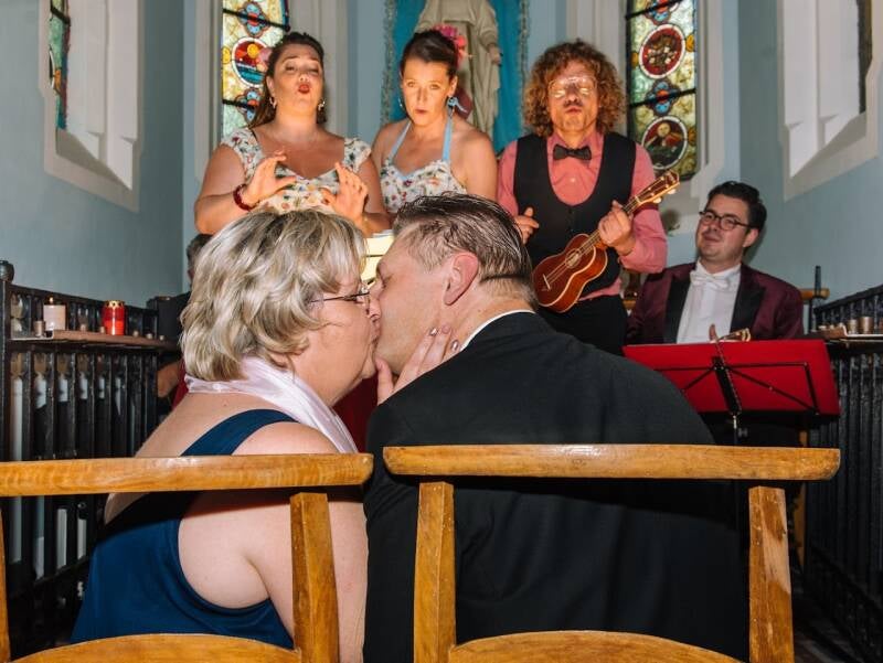 Deze formule is uiterst geschikt voor wie het begrip 'romantiek' geen grenzen kent. Doorgaans treden de Flamingo Sisters op als 's werelds enige muzikale relatiebureau en brengen ze met hun betoverende golden oldies een hommage aan alles wat een hommage verdient. In onze Wedding Chapel verzorgt deze muzikale familie een volledige ceremonie ter ere van bruid en bruidegom, waarin De Liefde hoogtij viert en de zakdoek niet droog blijft. De zusjes Sabrina en Samantha, koninginnen van de close harmony, bezingen het koppel in kwestie terwijl broer Wim het ja-woord en het uitwisselen van de ringen begeleidt. En nonkel Rudy en broertje Gregory, die zijn er ook bij. Deze ceremonie duurt 30 tot 60 minuten (bespreekbaar).